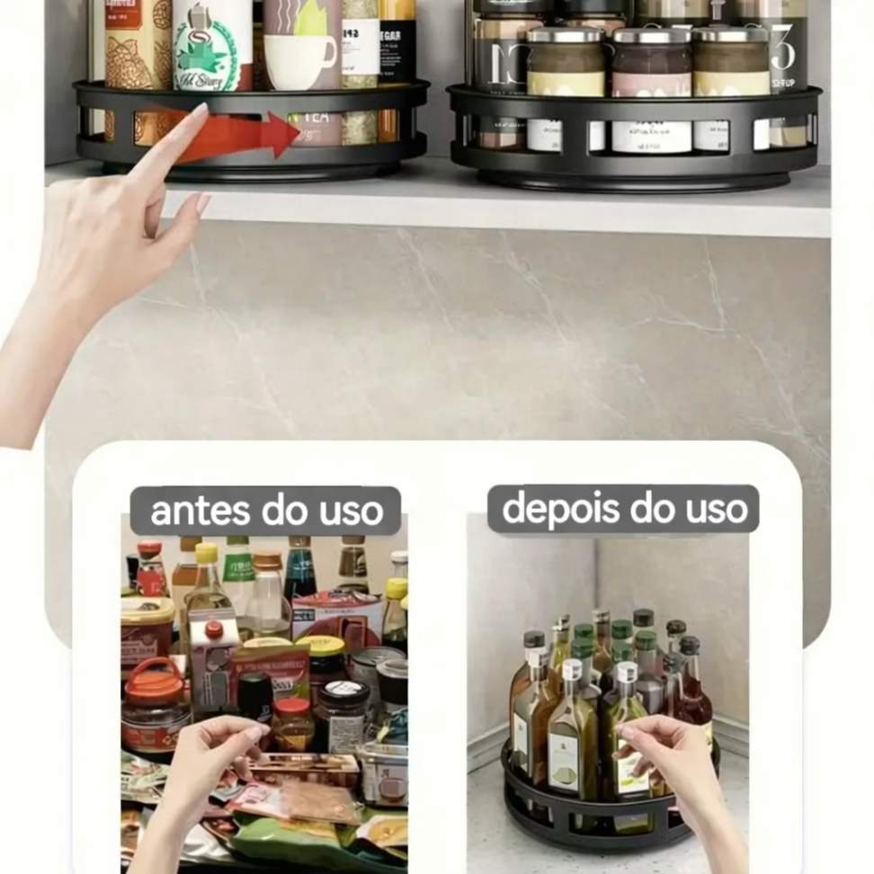 O Organizador Rotativo Multiuso 360° é a união perfeita entre forma e função — e está com estoque limitado. Garanta o seu agora e descubra como um simples detalhe pode reorganizar toda a sua rotina.